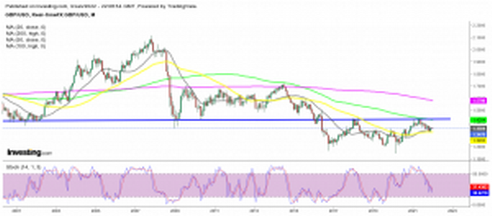 On the weekly chart, we see that the GBP/USD has been on a rollercoaster ride in the last five years, with the top of the range being the resistance above 1.40. In the first attempt, the 200 SMA (purple) added to the resistance level and provided resistance again in 2020, before the covid crash, but this moving average might have turned into support now. After the second rejection at the resistance zone, GBP/USD turned bearish in the summer of last year and fell from 1.4250s to 1.3150s, where the 200 SMA was standing, and towards the end of 2020, this pair started bouncing off that moving average, as the BOE hiked interest rates.